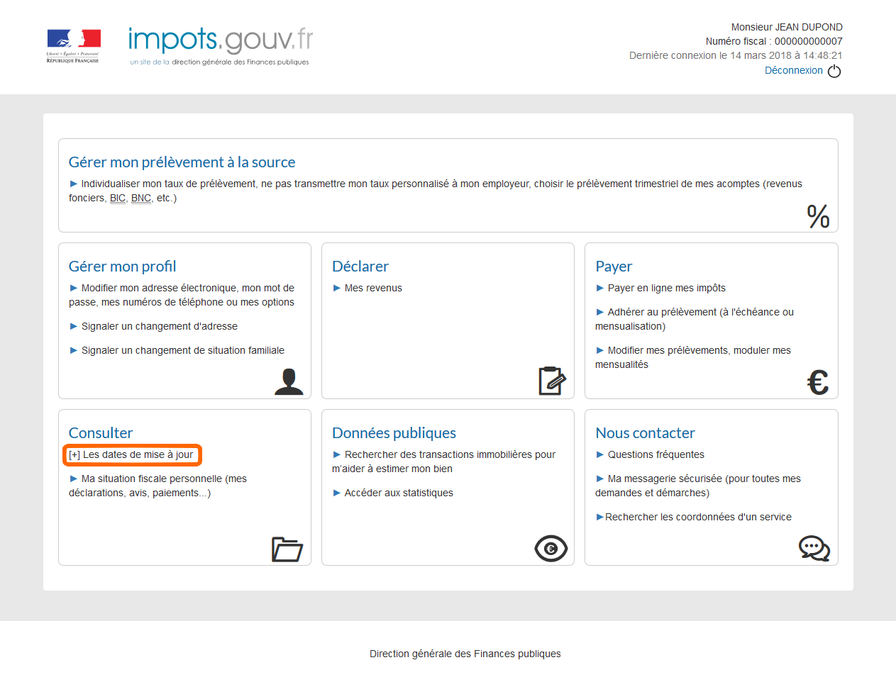 L'usager peut consulter le document récapitulant les dates de mise en ligne des informations concernant sa situation fiscale personnelle.