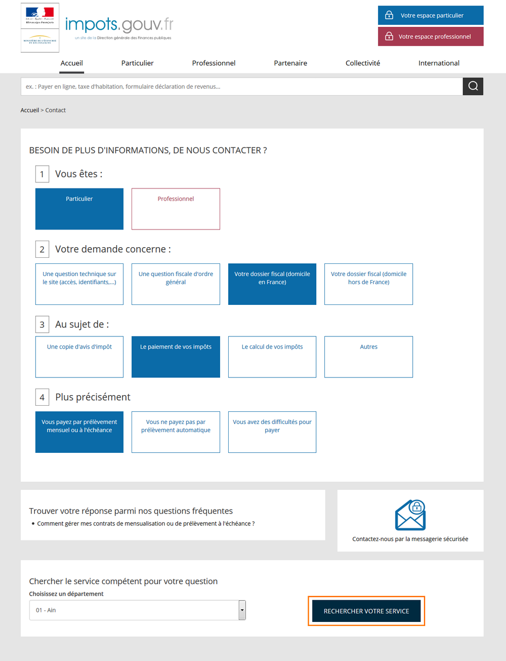L’usager sélectionne un département et clique sur « Rechercher votre service ».