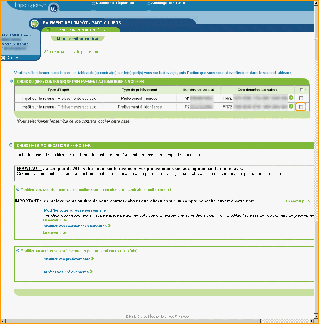 L'usager doit sélectionner le contrat de prélèvement automatique à modifier en cochant la case située en bout de ligne.